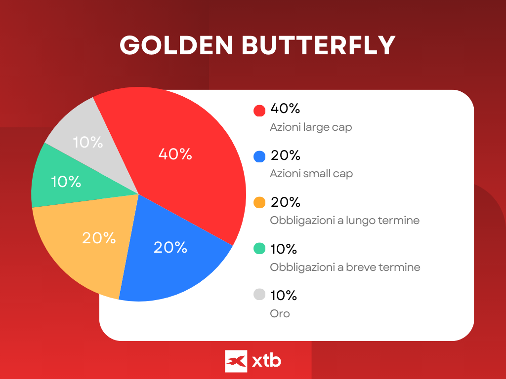 Il Golden Butterfly è una variante più dinamica del 60/40, con una struttura pensata per massimizzare la diversificazione. La composizione tipica prevede: 40% azioni large cap, 20% azioni small cap, 20% obbligazioni a lungo termine, 10% obbligazioni a breve termine e 10% oro. Questo portafoglio mira a combinare crescita, stabilità e protezione dai rischi macroeconomici. La quota maggiore di azioni small cap offre potenziale di rendimento superiore, mentre le obbligazioni e l’oro riducono la volatilità complessiva.