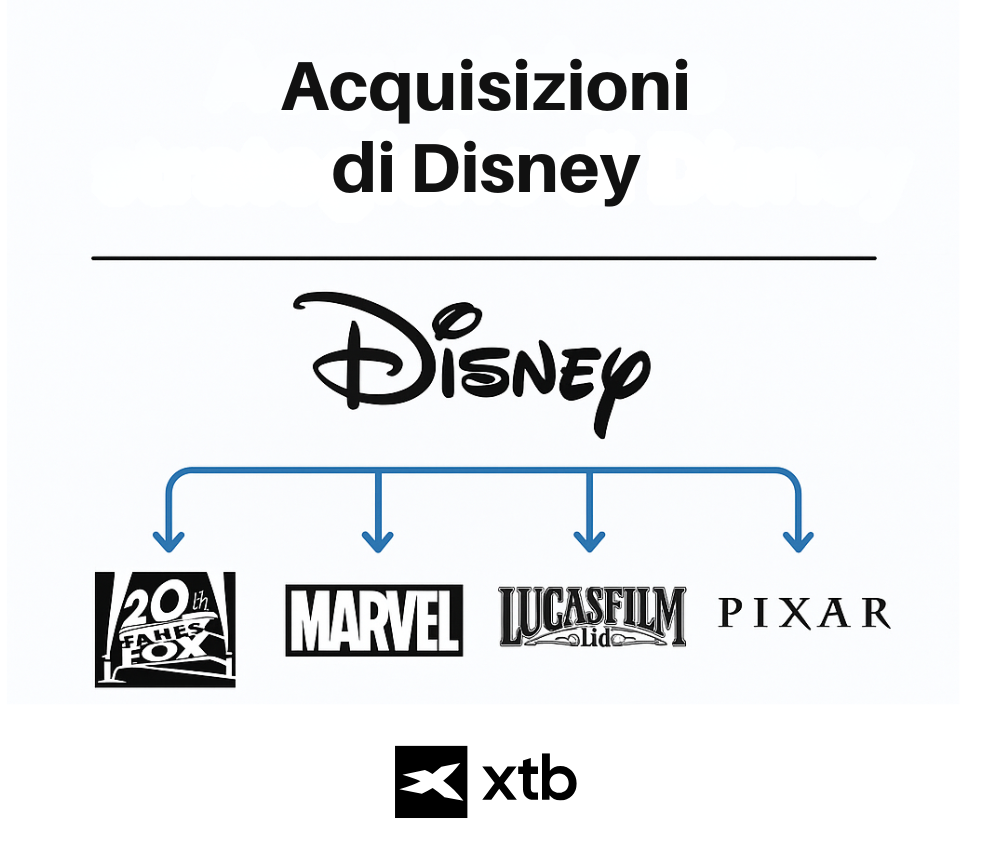 Le principali acquisizioni includono Pixar, Marvel, Lucasfilm, 20th Century Fox, oltre a quote in ESPN e Hulu, che rafforzano lo streaming e il portafoglio di contenuti.
