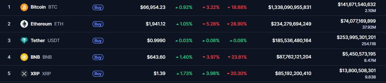 Bitcoin è scambiato a 66.863,53 $, con un rialzo giornaliero dello 0,84%, settimanale del 3,35% e mensile del 18,99%. La capitalizzazione di mercato raggiunge 1.336 miliardi di dollari, sostenuta da volumi di scambio pari a 141,39 miliardi. Con 19,98 milioni di BTC in circolazione, la criptovaluta mantiene una posizione dominante, confermando il suo ruolo di asset guida del mercato. Il movimento recente suggerisce una fase di consolidamento all’interno del trend rialzista di lungo periodo.