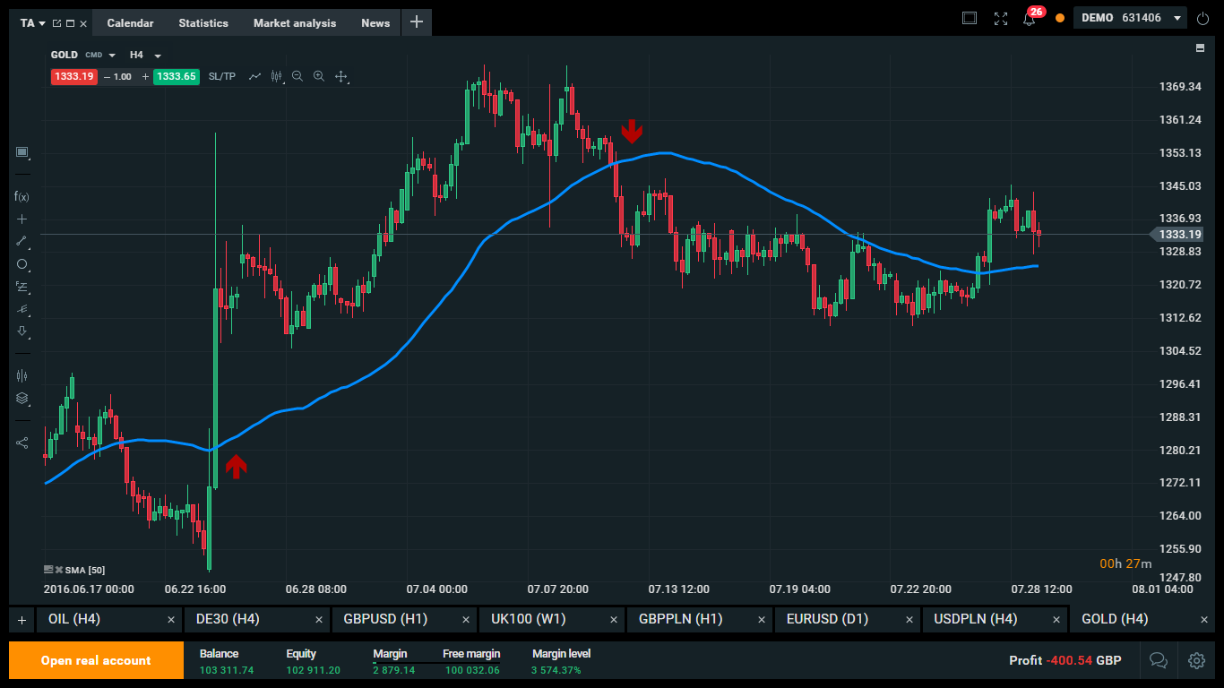 Nell’esempio mostrato sopra una SMA di 50 periodi è stata applicata allo strumento Gold. Come si può vedere, il mercato ha prima dato un segnale di acquisto, dopo di che ha guadagnato in valore. Successivamente il mercato ha intersecato la SMA dall’alto fornendo un segnale di vendita, dopo di che il mercato è calato.