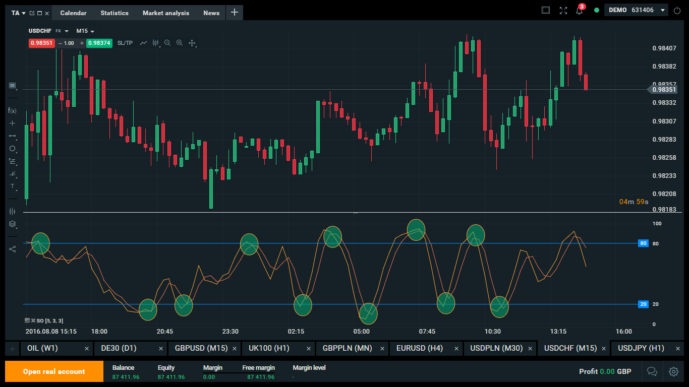 Nel secondo esempio, il range è stato basato sull’ Oscillatore Stocastico, che oscilla tra il livelli di 0 e 100. Il range trader cercherà di andare long dopo la rottura del livello 20 dal basso, e cercherà invece di andare short dopo la rottura del livello 80 dall’alto.
