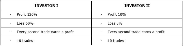 Diamo un'occhiata a due trader che iniziano entrambi con $ 10.000 e utilizzano un rapporto di rischio di ricompensa di 2:1, ma applicano livelli molto diversi di gestione del denaro nel loro trading. Il primo trader utilizza un approccio molto aggressivo, rischiando il 60% del proprio capitale su ogni operazione e cercando di ottenere un profitto al 120%. Il secondo trader è molto più prudente e rischia solo il 5% dei fondi del proprio conto con un profitto del 10%. Per semplicità, diciamo che ogni trader ha lo stesso set di dieci operazioni e che ogni secondo scambio è redditizio.