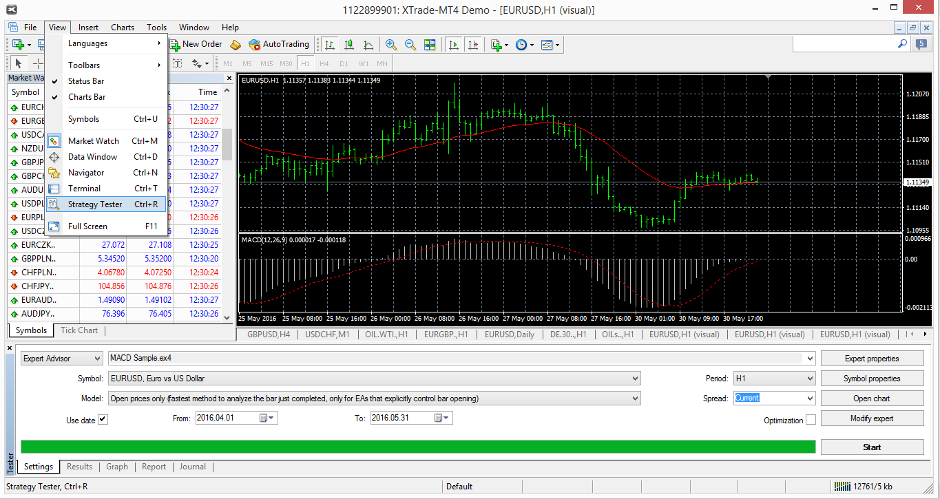 La Metatrader 4 ti consente l’uso di strategie di trading automatizzate (gli EA) ed anche l’esecuzione di test retrospettivi su esse con lo Strategy tester di MT4. Puoi usare questa funzione per analizzare i tuoi risultati ed ottimizzare la tua strategia automatizzata. Per attivare lo Strategy tester, seleziona l’opzione Tester strategia da “Visualizza” in alto nella barra degli strumenti oppure premi CTRL + R sulla tastiera.