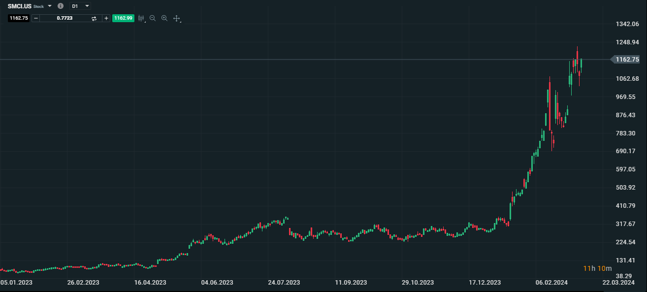 La società ha avuto la sua offerta pubblica iniziale nel 2007, quando SMCI è stata quotata in borsa a 8 dollari. Attualmente le sue azioni vengono scambiate a circa 1.163,00 dollari.