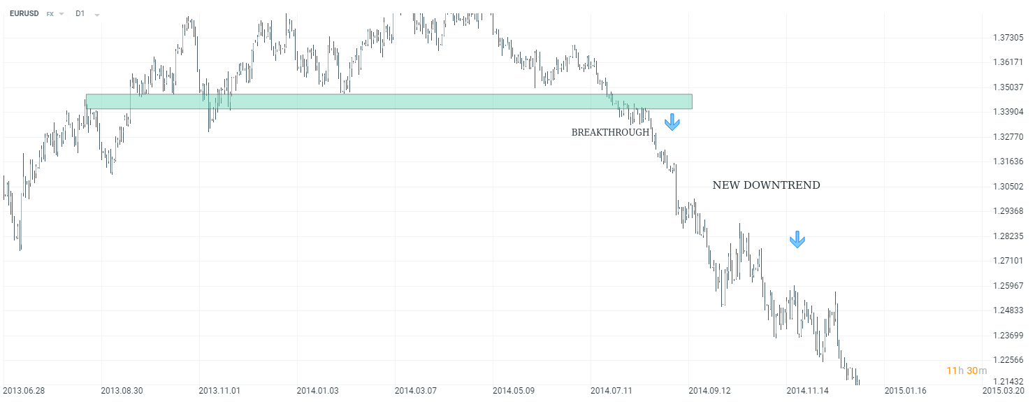 Quando i livelli di supporto/resistenza vengono rotti, in genere si verifica una svolta o un rimbalzo, fino a quando non viene trovato un altro livello di supporto o resistenza. Ad esempio, EURUSD potrebbe incontrare difficoltà a superare 1,15. Potrebbe testare questa barriera due o tre volte prima di rimbalzare al di sotto, o alla fine potrebbe sfondare.