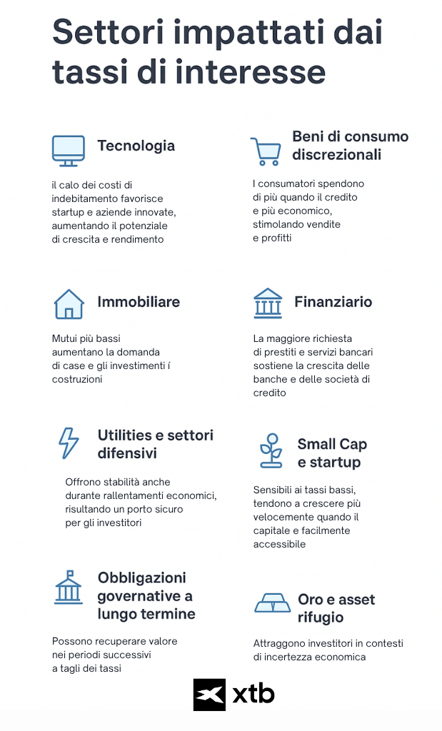 Settori come tecnologia, immobiliare e beni di consumo discrezionali tendono a crescere con tassi bassi, grazie a prestiti più accessibili e maggiore capacità di spesa dei consumatori.