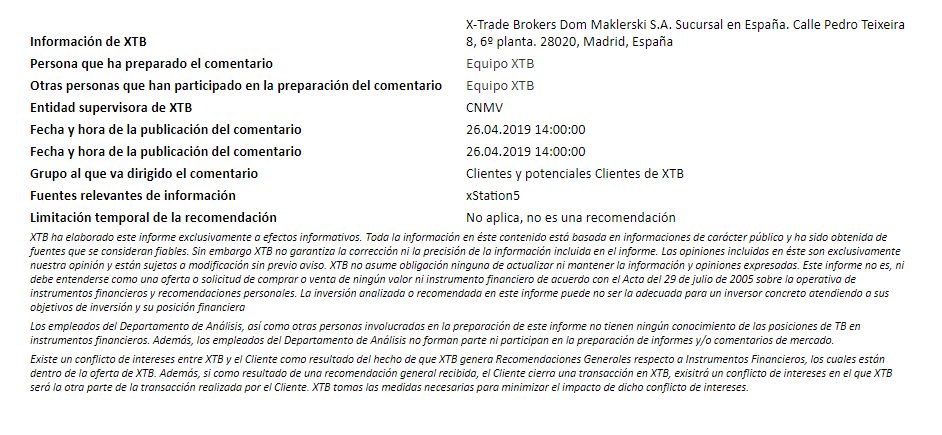 "Este informe se proporciona sólo con fines de información general y con fines educativos. Cualquier opinión, análisis, precio u otro contenido no constituyen asesoramiento de inversión o recomendación en entendimiento de la ley de Belice. El rendimiento en el pasado no indica necesariamente los resultados futuros, y cualquier persona que actúe sobre esta información lo hace bajo su propio riesgo. XTB no aceptará responsabilidad por ninguna pérdida o daño, incluida, sin limitación, cualquier pérdida de beneficio, que pueda surgir directa o indirectamente del uso o la confianza de dicha información. Los contratos por diferencias (""CFDs"") son productos con apalancamiento y acarrean un alto nivel de riesgo. Asegúrese de comprender los riesgos asociados. "