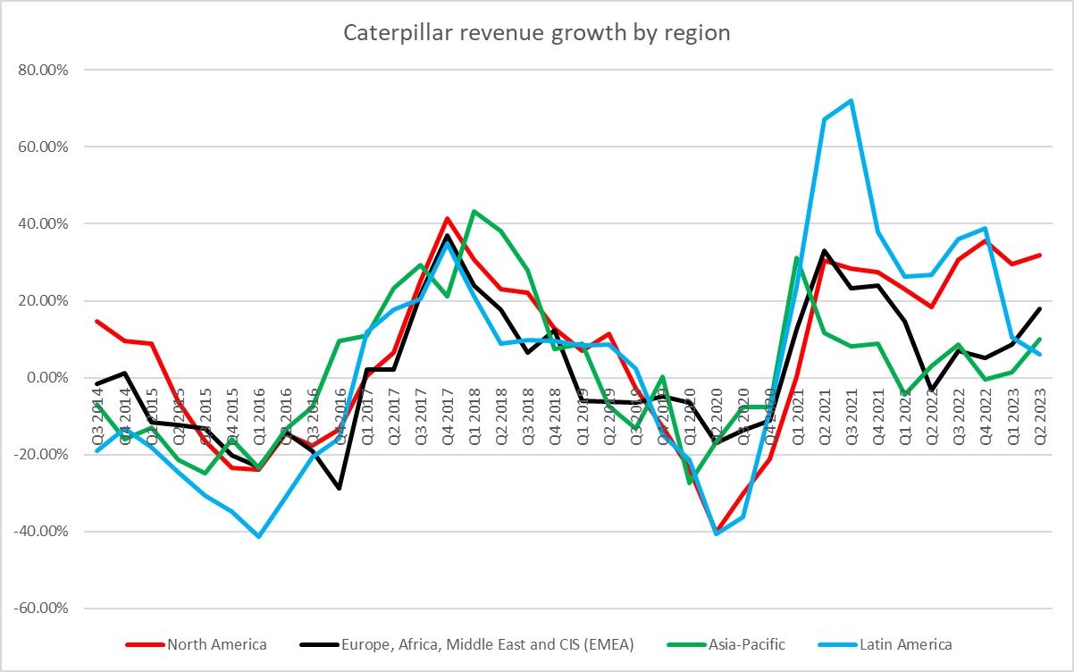 Sin embargo, debe decirse que esta caída en la participación china se debe no solo a un desempeño comercial más débil de lo esperado en China, sino también a las fuertes ventas en otros lugares. Después de todo, América Latina fue la única región importante en la que Caterpillar registró un crecimiento más lento que en el primer trimestre de 2023.