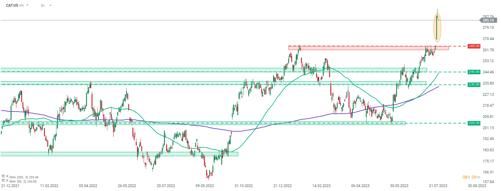 Echando un vistazo al gráfico de Caterpillar (CAT.US) en el intervalo D1, podemos ver que la acción estaba probando la zona de resistencia de 265,00 $ antes de la publicación de resultados (círculo naranja). Esta zona estuvo marcada con máximos históricos anteriores y los alcistas lucharon por superarla desde mediados de julio de 2023. El aumento posterior a los resultados empujó a las acciones por encima y después de una apertura más alta el martes, el precio de las acciones continuó subiendo y cerró en un máximo histórico. por encima de 288 $. Ayer se alcanzó un máximo histórico intradiario ligeramente por debajo de la marca de 294 $. El impulso alcista parece haberse ralentizado con el lanzamiento de las acciones en el comercio de hoy un poco más bajo. Sin embargo, algunas tomas de beneficios no deberían ser una sorpresa dadas las fuertes alzas recientes.