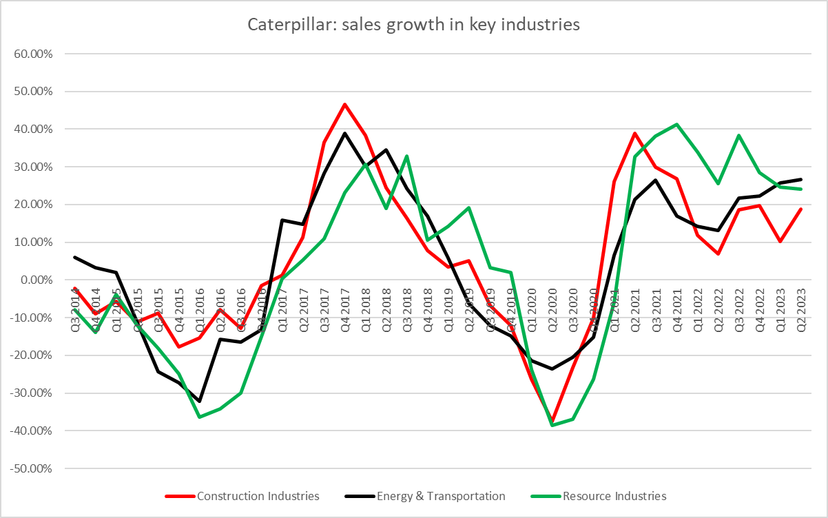 Lo que hace que el segundo trimestre de 2023 de Caterpillar sea aún mejor es el hecho de que la mejora en el negocio fue de base amplia. La compañía reportó un crecimiento de ingresos superior al 20% en cada una de las 3 industrias clave, con Energía y Transporte logrando el mayor crecimiento. Industrias de la Construcción fue la industria más rentable con un margen de beneficio que saltó del 16,4% al 25,2% y representó casi la mitad de los beneficios de la empresa durante el trimestre.