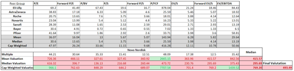 La valoración mediante múltiplos compara el valor de la empresa que se está valorando con el de otras empresas que operan en una industria similar. La limitación de este método de valoración es, en particular, la selección de empresas y su diferencia en tamaño y naturaleza de las operaciones con respecto a la empresa que se está valorando. Esta limitación es particularmente evidente cuando se analiza Novo Nordisk debido a la posición dominante de la empresa en el mercado de medicamentos contra la obesidad, que actualmente es el componente más importante de la valoración de la empresa.