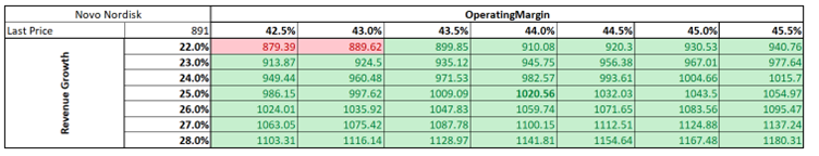 Con estas suposiciones, el resultado de la valoración es un precio por acción de 1.020,56 coronas danesas, un 14% más alto que el último precio de cierre.