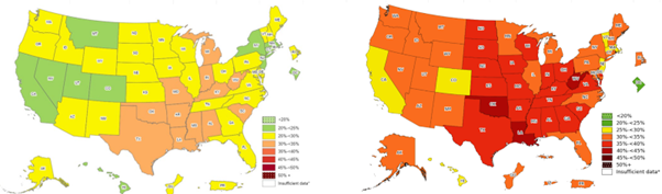 Mapas que muestran el porcentaje de adultos con un IMC mayor o igual a 30 kg/m2 en EE. UU. en 2011 (izquierda) y 2022 (derecha). Fuente: Centros para el Control y la Prevención de Enfermedades