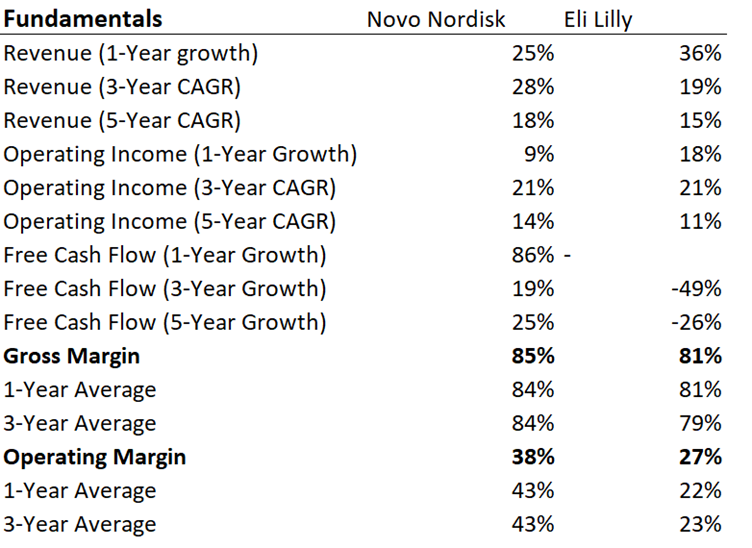 La diferencia también se puede ver en los márgenes, que son más altos para Novo Nordisk, aunque es probable que la compañía tenga un desempeño por debajo de sus promedios de los últimos 3 años este año debido a deterioros únicos y al impacto negativo de las monedas.