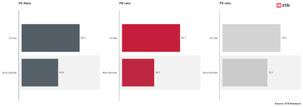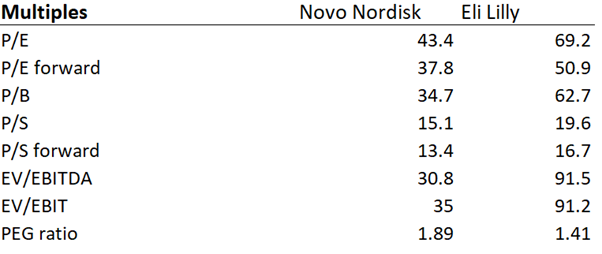 Múltiplos seleccionados de Novo Nordisk vs Eli Lilly. Fuente: XTB Análisis
