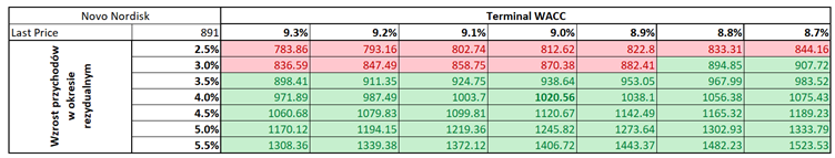Cabe señalar que el método de DCF se basa en una serie de supuestos, cada uno de los cuales tiene un efecto significativo en el efecto de valoración. En el caso de Novo Nordisk, decidimos realizar un pronóstico detallado para un período de 5 años. A nivel de crecimiento de los ingresos, asumimos un valor del 25% debido al sector de medicamentos para el tratamiento de la obesidad, que sigue creciendo rápidamente, lo que debería dar como resultado una fuerte dinámica de ingresos en los próximos años. Al mismo tiempo, creemos que será más difícil para la empresa mantener la dinámica de los últimos 3 años debido a la base más alta. Hemos asumido un margen operativo ligeramente superior a la media de 3 años, del 44%. El coste ponderado del capital durante el período de pronóstico se ha fijado en el 9%. Otros valores se basan en medias de 5 años.