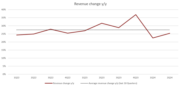 Novo Nordisk ha registrado un crecimiento interanual de sus ingresos del 25% en el segundo trimestre de 2024, hasta los 68.000 millones de coronas danesas (unos 9.800 millones de dólares), un 1% por debajo de las previsiones de consenso de los analistas. La tasa de crecimiento de los ingresos se situó ligeramente por debajo de la media de los últimos 10 trimestres, que es del 27%. Sin embargo, sigue siendo relativamente estable, lo que es especialmente positivo en vista de la base comparativa, que sigue creciendo.