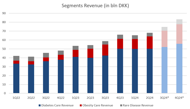 Entre los segmentos, la empresa registró el mayor crecimiento de los ingresos en el segmento de tratamiento de la obesidad (+35% interanual), donde los ingresos se sustentan principalmente en las ventas todavía en auge de Wegovy (+55% interanual). A pesar de un impulso tan fuerte, los ingresos de este medicamento se situaron más de un 16% por debajo de las expectativas, con 11.700 millones de coronas danesas (1.700 millones de dólares). La desaceleración en relación con las expectativas (y la dinámica de los trimestres anteriores; el segundo trimestre de 2024 fue el primer trimestre desde el lanzamiento del medicamento en el que las ventas de Wegovy crecieron a una tasa inferior al 100% interanual) provocó una reacción negativa del mercado, ya que Wegovy sigue siendo actualmente el medicamento más seguido de cerca de la empresa. Las actitudes de los inversores hacia los medicamentos contra la obesidad se pueden comparar con el sentimiento en torno a la inteligencia artificial, que actualmente es uno de los aspectos clave que atrae la atención de los inversores hacia el rendimiento de las empresas de tecnología.