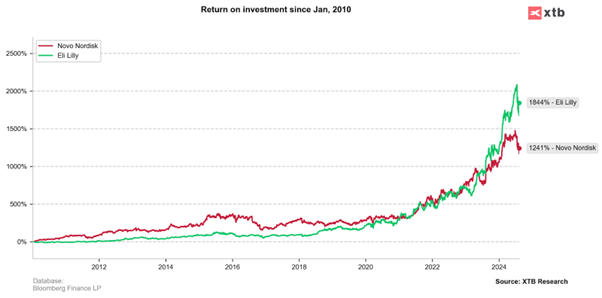 Comparación de las cotizaciones de Eli Lilly y Novo Nordisk. Fuente: XTB Research