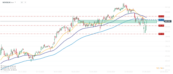 La primera reacción a los resultados de Novo Nordisk del miércoles fue un fuerte descuento para la compañía, que empujó el precio de las acciones a su nivel más bajo desde marzo de este año, interrumpiendo así la fuerte tendencia alcista que prevalecía desde principios de este año. Sin embargo, parece que la corrección del precio de las acciones fue temporal y los alcistas están tomando el control del precio de las acciones nuevamente. La compañía rebotó en el nivel de soporte en torno a 807 coronas danesas y rompió la primera resistencia cerca de 862 coronas danesas. El precio está cerca del nivel de consolidación de abril. Si rompe por encima de esta esfera, el siguiente nivel importante será la media móvil exponencial de 100 sesiones (EMA100) cerca de 903 coronas danesas. Si este nivel también se perfora, la siguiente resistencia importante a la que los operadores deben prestar atención está en 930 coronas danesas.