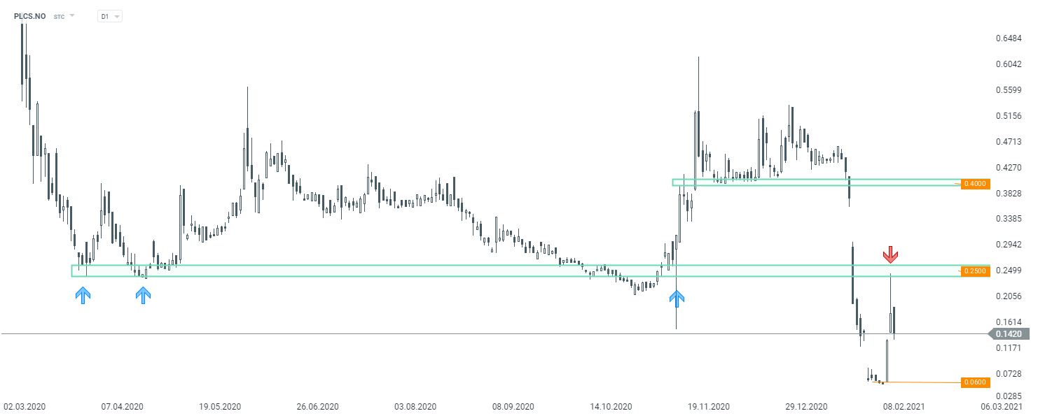 Polarcus (PLCS.NO) cotiza un 70% más bajo en lo que va de año. La empresa tiene más del 200% los martes y miércoles de esta semana. Sin embargo, el avance fue detenido por la zona de precios en 0.25 y el movimiento a la baja se reanudó hoy. Dado que la empresa ha incumplido sus obligaciones y las posibilidades de continuar como empresa en marcha son escasas, los fundamentos respaldan un retroceso hacia los mínimos recientes.