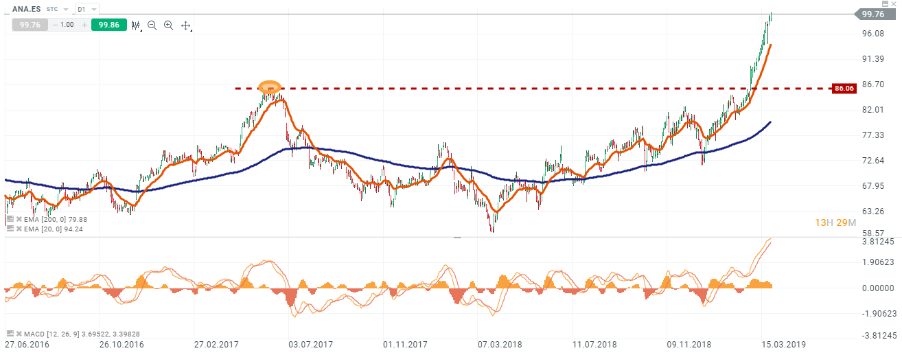 Los títulos de Acciona viene mostrando un buen comportamiento desde su mínimo absoluto registrado en 2012 en los 32 euros, y sobre todo es de enmarcar el buen inicio de año con una revalorización de sus acciones de más de un 30%, es el mejor valor dentro del selectivo español en este 2019. Ahora la cotización se va a enfrentar a una zona de resistencias clave cercanas a la cota de los 102 euros, estos niveles de precios no se veían en la entidad desde la crisis mundial en 2009.