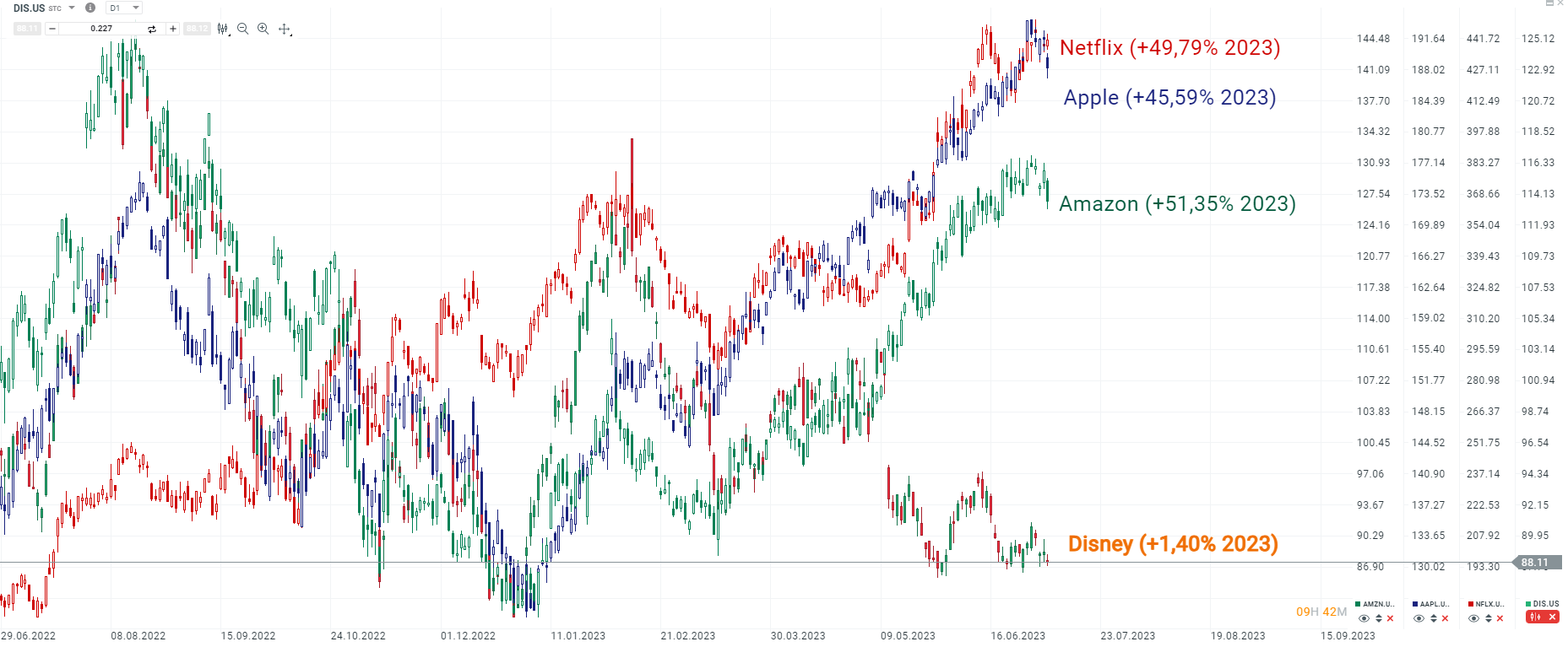 Gráfico comparativo de Disney vs Netflix, Apple y Amazon. Fuente: xStation
