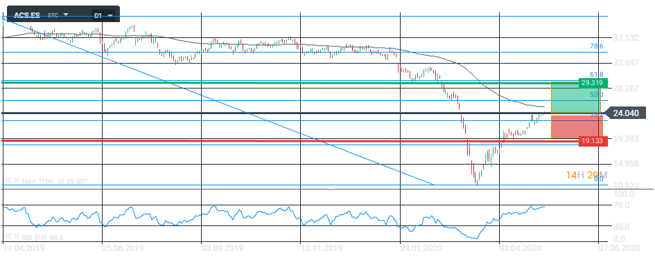 Por el contrario, una decepción en los resultados podría hacer caer el precio de las acciones de la constructora. La media móvil de 100 sesiones (linea gris) aun se sitúa por debajo del precio en bolsa de la cotizada. Además, el RSI se sitúa muy cerca del nivel 70 que indicaría sobrecompra de papel. En este sentido, para intentar minimizar el riesgo de la operación sería interesante situar un stop por debajo del último mínimo local de los 19,1 euros.