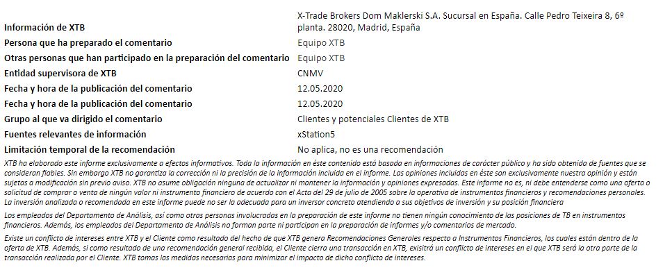 "Este informe se proporciona sólo con fines de información general y con fines educativos. Cualquier opinión, análisis, precio u otro contenido no constituyen asesoramiento de inversión o recomendación en entendimiento de la ley de Belice. El rendimiento en el pasado no indica necesariamente los resultados futuros, y cualquier persona que actúe sobre esta información lo hace bajo su propio riesgo. XTB no aceptará responsabilidad por ninguna pérdida o daño, incluida, sin limitación, cualquier pérdida de beneficio, que pueda surgir directa o indirectamente del uso o la confianza de dicha información. Los contratos por diferencias (""CFDs"") son productos con apalancamiento y acarrean un alto nivel de riesgo. Asegúrese de comprender los riesgos asociados. "