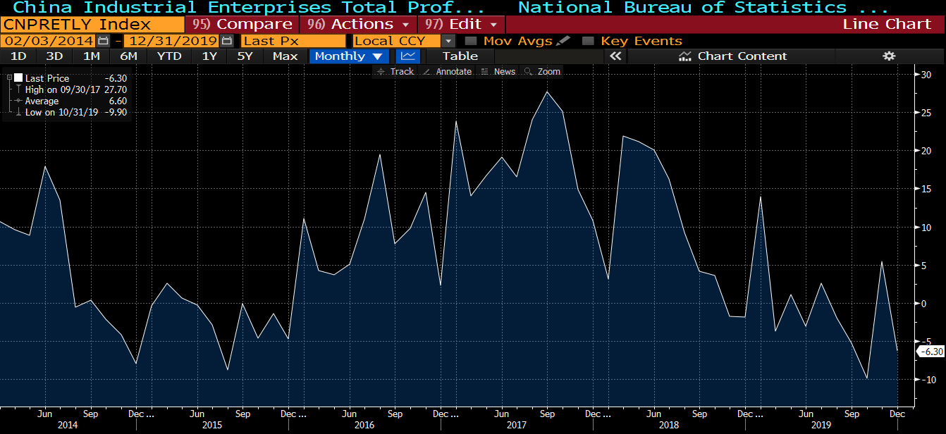 Los beneficios corporativas en China cayeron en diciembre. Los datos de Q1 están alineados para ser mucho peores. Fuente: Bloomberg