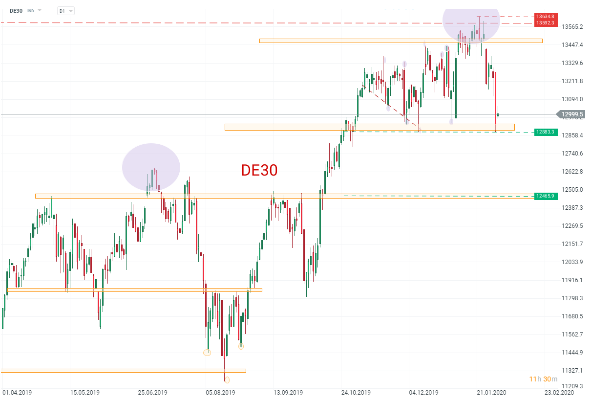Después de una falsa ruptura, DE30 intenta defender el área de soporte 12900. Fuente: xStation5