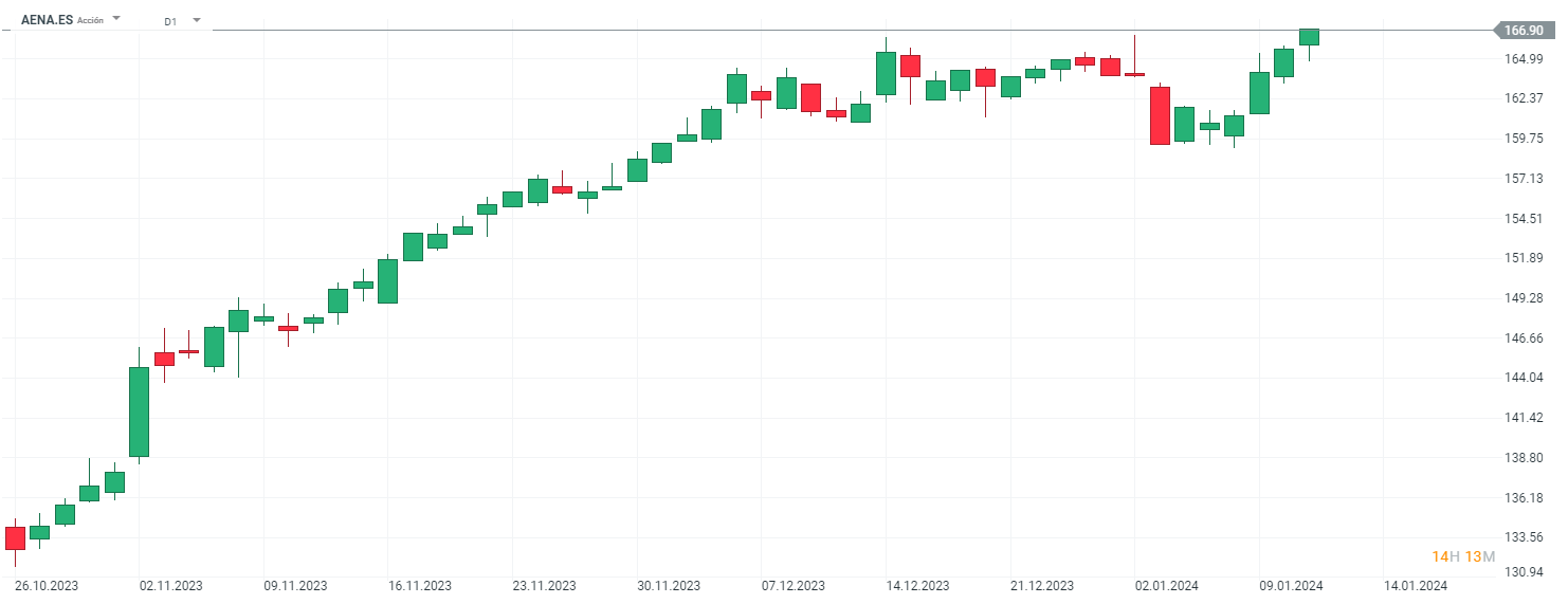 Las acciones de Aena comienzan de manera positiva este 2024 tras un buen 2023 tanto en bolsa como a nivel de tránsito de pasajeros en sus aeropuertos.