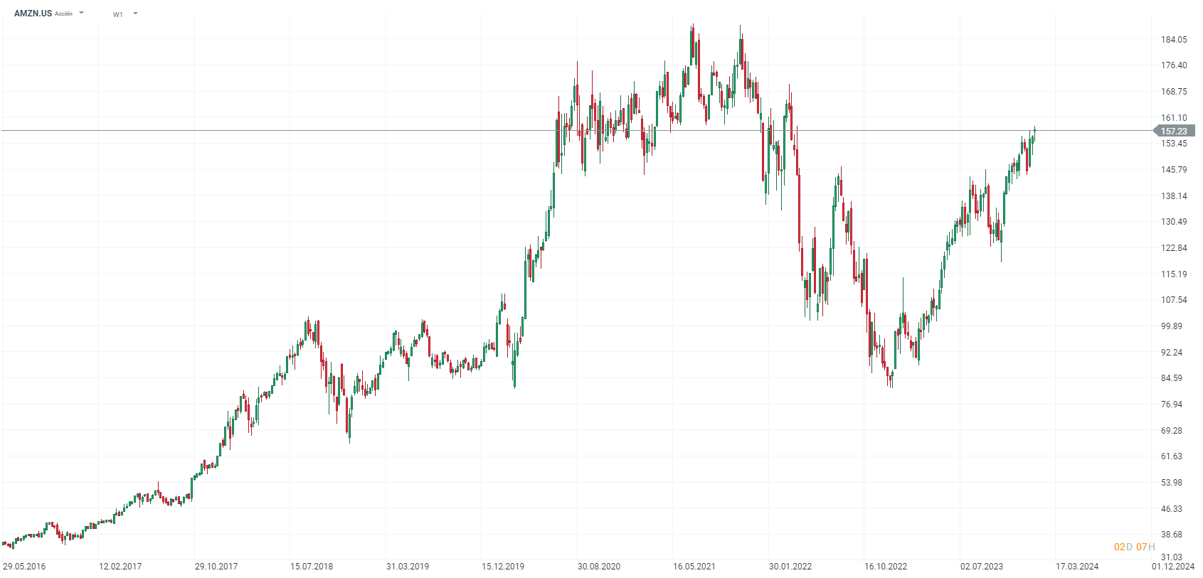 Las acciones de Amazon subieron más de un 80% en 2023 tras anotarse un mal 2022. Este 2024 ya sube un 5%.