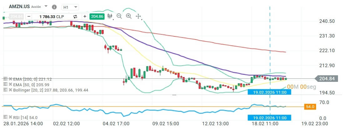 La cotización de Amazon (AMZN.US) registró ayer una fluctuación marginal, cerrando con una rentabilidad cercana al 0%. Este estancamiento refleja la inseguridad de los inversionistas respecto a la magnitud de los próximos gastos de capital, ya que el mercado cuestiona si los hitos en ingresos recientemente alcanzados podrán absorber las inversiones proyectadas para infraestructura, chips y centros de datos. Esta indecisión se manifiesta en el ancho de las bandas de Bollinger, que actualmente ofrecen espacio para una oscilación de corto plazo sin una dirección definida. Aunque el precio de los US$ 204,84 ha logrado posicionarse ligeramente por encima de la media de las bandas, el RSI en los 54 puntos ratifica la ausencia de un sesgo fuerte, situando al activo en una zona de neutralidad técnica.