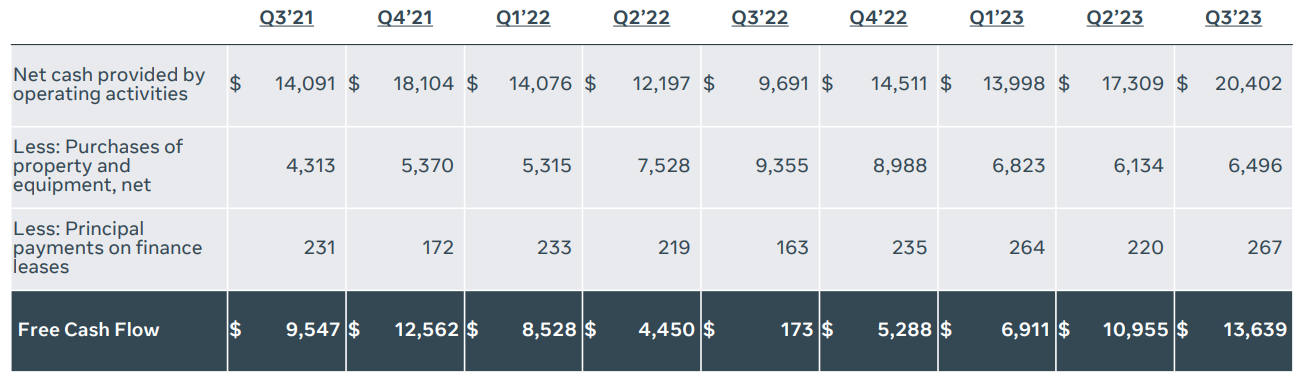 Una de las variables más importante a observar en los resultados de una empresa es el flujo de caja libre y Meta es una de esas compañías que son capaces de reportar cifras crecientes a pesar de invertir mucho capital para crecer. En esta ocasión, la comparación tampoco es justa por los motivos mencionadoa anteriormente, pero si lo comparamos con la cifra del trimestre anterior también ha reportado un crecimiento del 24,5%