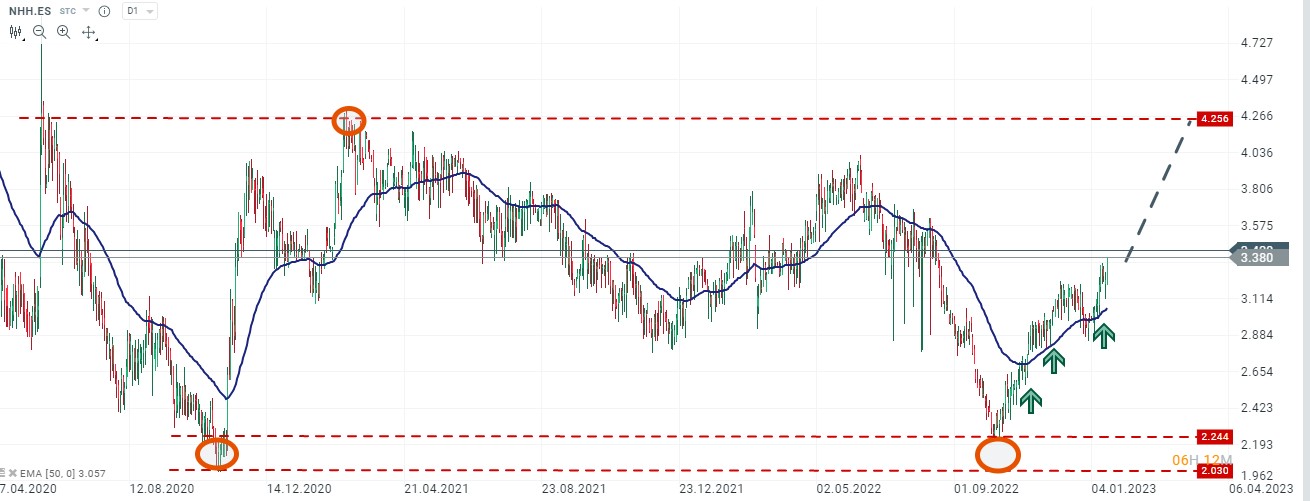A nivel técnico, se observa la cotización en un canal lateral desde 2020 ante la incertidumbre de los resultados en estos años por la situación del covid; actualmente tras alcanzar los mínimos en septiembre de 2022 se encuentra con una estructura de máximos-mínimos crecientes y con perspectivas hacia la zona de resistencia en los 4,25€.