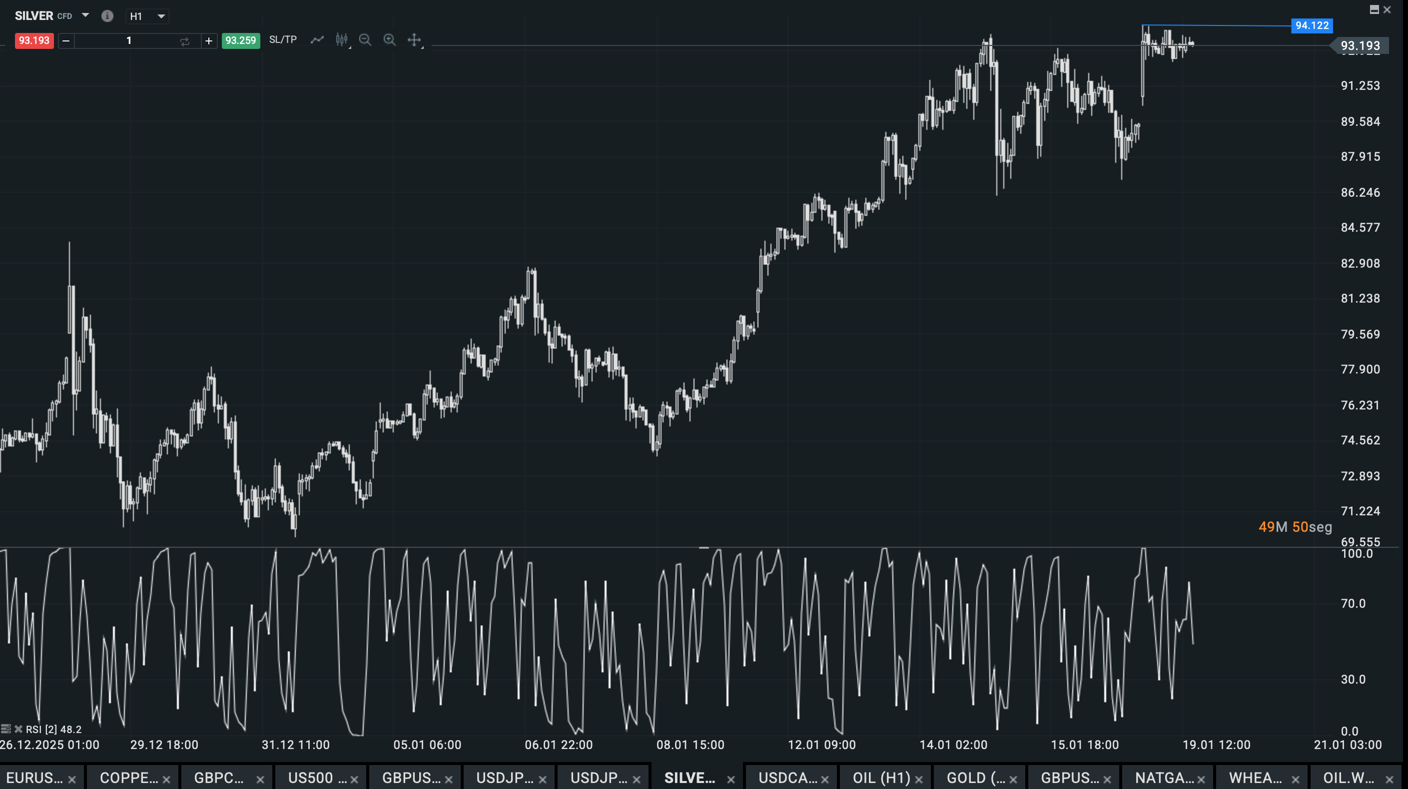 El movimiento alcista se ha acelerado con fuerza tras superar los 90 dólares por onza, y el nuevo máximo en 94,12 se ha convertido en la referencia psicológica inmediata. No es un nivel cualquiera. Es la confirmación de que el mercado ha entrado en una fase distinta, donde la plata deja de comportarse como el “hermano pequeño” del oro y pasa a jugar su propia partida. Mientras el precio se mantenga consolidando por encima de estos máximos históricos, el sesgo sigue siendo claramente alcista y el mercado queda abierto a extensiones adicionales.