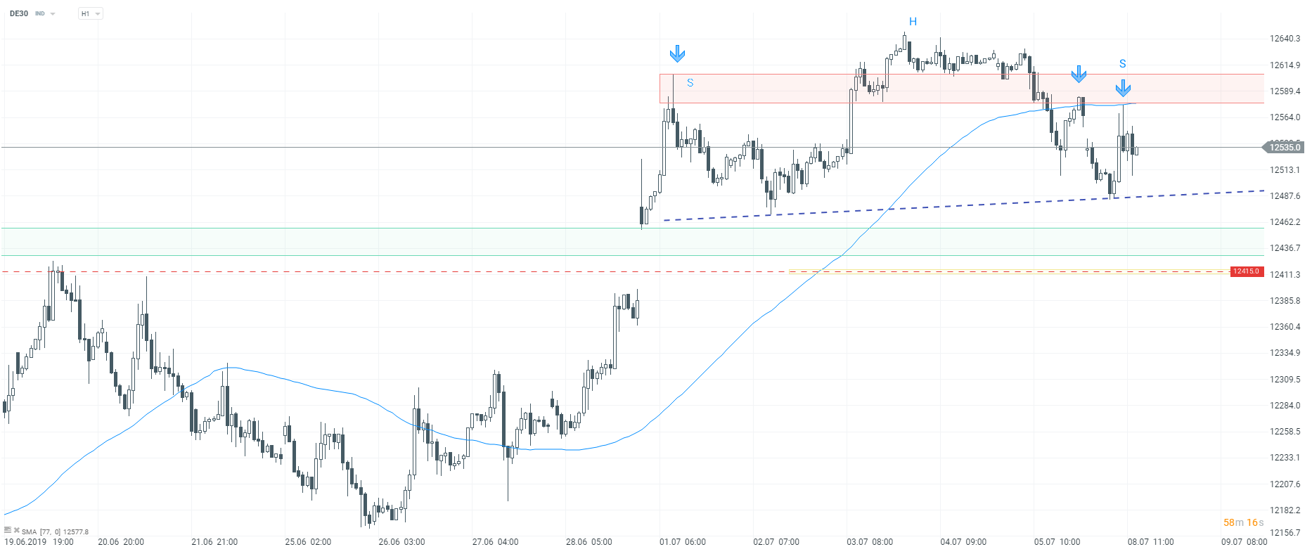 Por último, pero no menos importante, observando el intervalo intradiario, intervalo H1, se puede detectar el patrón de inversión de tendencia. Se está formando un patrón potencial de cabeza y hombros. Una ruptura por encima de la zona de resistencia a corto plazo con un rango de 12575-12600 pts invalidaría esta configuración técnica. En caso de que la configuración se realice de manera ortodoxa, existe la posibilidad de que el precio baje a 12450 puntos o incluso a 12415 puntos. Sin embargo, el mercado necesita vencer el cuello primero.