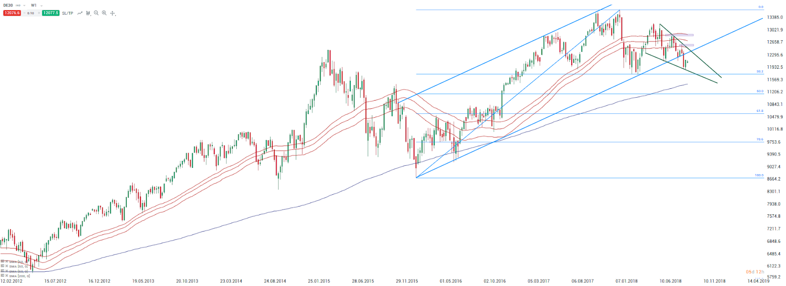 Durante las últimas semanas, el DAX alemán no dió muchos motivos para animar a los inversores, especialmente en comparación con los puntos de referencia de Wall Street. Las ganancias y los aranceles más débiles en los automóviles europeos se ponderaron en la valoración de las blue chips alemanas. Mirando desde una perspectiva más amplia, el índice sigue cotizando por debajo de la línea de tendencia alcista. El canal de medias móviles (medias móviles de 50 sesiones) también comienza a inclinarse hacia abajo. Los mínimos de este año podrían considerarse como el nivel de soporte clave ya que tanto el 38.2% de fibonacci del mayor impulso alcista como la media móvil de 200 sesiones coinciden.