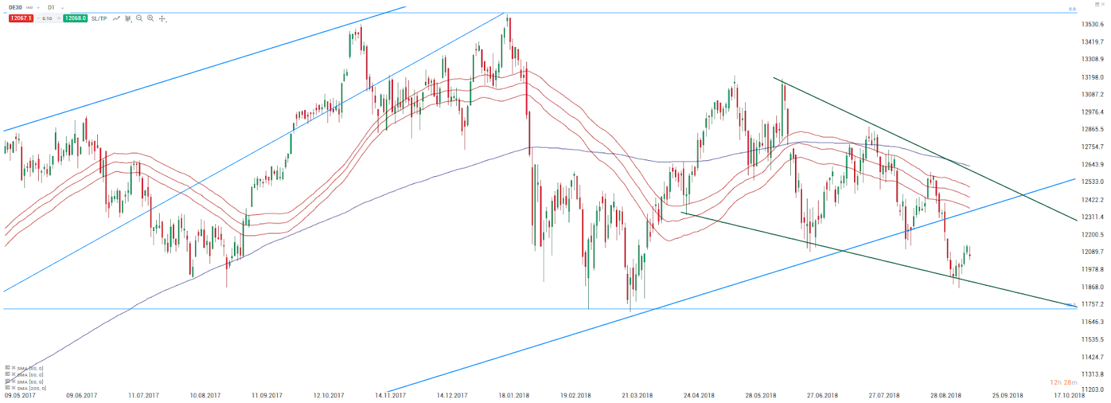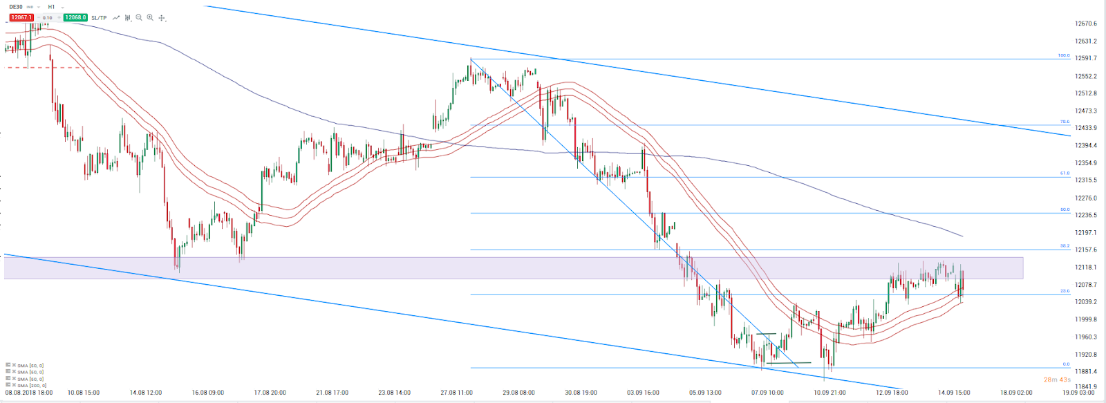 Pasando al marco diario, se puede ver que las últimas caídas se detuvieron cerca del límite inferior del patrón de cuña descendente (iniciado en mayo). A pesar de abrir a la baja el lunes, los compradores del DAX intentaron volver a subir al índice por encima del cierre del viernes. El reciente rebote registró un mayor precio en el área de los 12100 pts, donde se pueden encontrar los mínimos de mediados de agosto y de junio y julio. Mientras el nivel de 12100 puntos se mantenga firme, el aspecto técnico parece ser un buen augurio para los coros. En caso de que el conflicto comercial entre China y EE. UU. se intensifique, es probable que el índice alemán continúe avanzando hacia los mínimos de este año en torno a los 11700 puntos.