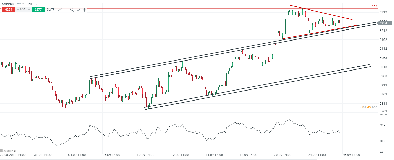 Por su parte el Cobre, continua con su consolidación triangular, de la cual podemos esperar que se geste un movimiento significativo en el precio (equivalente a la altura del propio triangulo). En caso de que la ruptura se produzca a la baja, deberíamos tener en mente la zona de los 6100 USD por tonelada, como principal soporte.