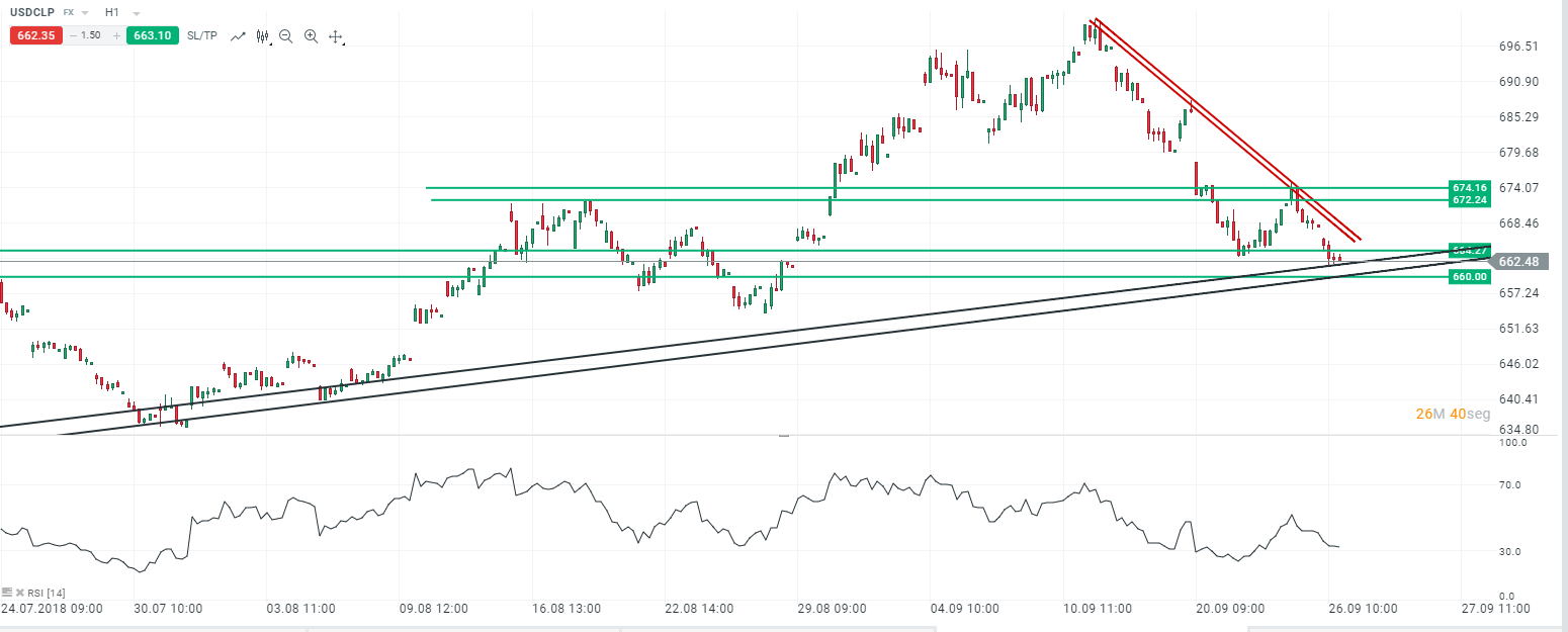 El Dólar contra el Peso continuó con el movimiento bajista que venia dibujando durante las últimas sesiones, situándose actualmente en la gran zona de soporte en las inmediaciones de los 660 Pesos por Dólar, donde coexisten el soporte del corto-medio plazo y la tendencia que ha venido guiando los precios durante los últimos 6 meses. Desde este punto, y con permiso de las declaraciones que pueda hacer Jerome Powell, presidente de la FED, se plantea como escenario más probable un nuevo movimiento expansivo a favor del Dólar, situación que iremos confirmando a medida que se vaya rompiendo la directriz bajista del corto plazo. De ser así, podríamos ver al Dólar cotizando en los 674-674 Pesos.