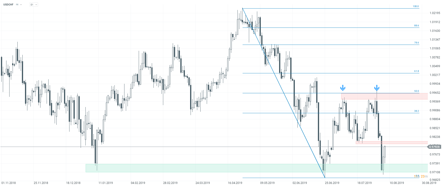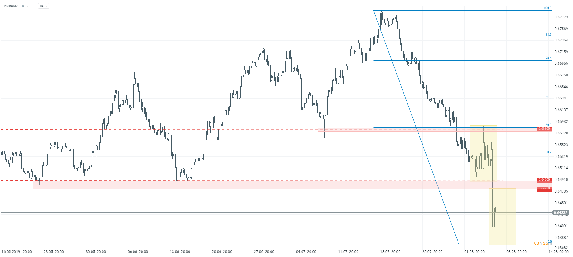 El kiwi es una de las principales divisas de peor desempeño el miércoles. El movimiento a la baja fue provocado por una sorprendente decisión de la RBNZ. El Banco de la Reserva de Nueva Zelanda decidió reducir los tipos de interés en 50 puntos básicos, mientras que el mercado esperaba un recorte de solo 25 pb. Durante la conferencia, el gobernador del banco también dijo que podría haber más recortes en los próximos meses y que no descarta la posibilidad de que las tasas caigan por debajo de cero en algún momento en el futuro. La situación en el gráfico no se ve bien para NZD. El tipo de cambio se rompió por debajo de la zona de soporte en 0.6800 con un fuerte impulso, e incluso superó los mínimos de 2018. Esto allanó el camino hacia una disminución mayor y mientras NZDUSD permanezca por debajo del área marcada con color rojo en el cuadro a continuación, esta configuración seguirá siendo válida. . A medida que RBNZ anunció más recortes de tipos,