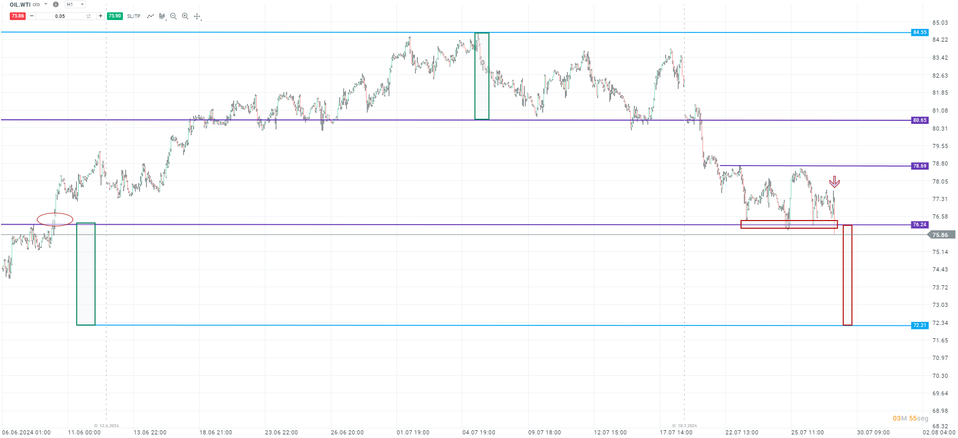 - Escenario bajista: Si el precio rompe definitivamente por debajo de 76.24, podríamos ver una continuación de la tendencia bajista hacia el próximo nivel de soporte en 72.21. La ruptura de este soporte clave podría indicar un fuerte impulso bajista, con los vendedores dominando el mercado.