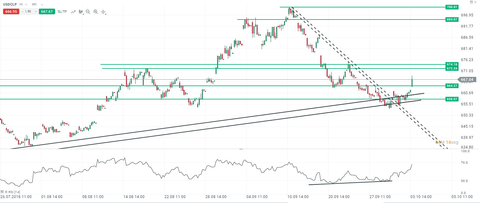 El USDCLP mostró esta mañana síntomas claros de debilidad por el lado del Peso. Tras varias sesiones coqueteando con la gran zona pivote de los 650 660 Pesos por Dólar, hemos visto como finalmente el impuso a favor del billete verde se ha hecho notar en la cotización local chilena. Desde estos niveles podemos esperar un ataque a la zona de resistencia de los 672 - 674 Pesos por Dólar. De cara al medio-largo plazo, el esperado rebote al que estamos asistiendo, abre de nuevo la posibilidad de un nuevo impulso a favor del Dólar que nos lleve a un nuevo a taque a los 700 USDCLP. Estaremos muy atentos a la evolución del par las próximas sesiones.