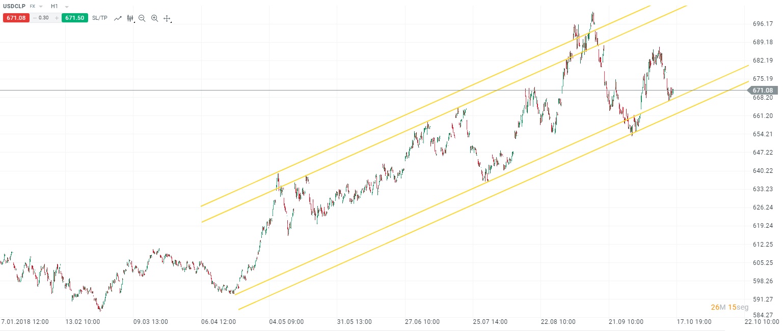 El USDCLP mostró esta mañana síntomas claros de debilidad, acusada a la fortaleza del dólar a nivel internacional. Tras varias sesiones coqueteando con la zona de resistencia de los 685 Pesos por Dólar, hemos visto como finalmente ha decantado hacia un ataque a la directriz bajista. El dólar mantiene una clara tendencia alcista de medio plazo, con pisos importantes en la zona entre 670 y 665 pesos por dólar. Desde estos niveles podemos esperar un ataque a la zona de resistencia de los 685 nuevamente. De cara al medio-largo plazo, el esperado rebote al que estamos asistiendo, abre de nuevo la posibilidad de un nuevo impulso a favor del Dólar que nos lleve a un nuevo a taque a los 700 USDCLP. Estaremos muy atentos a la evolución del par las próximas sesiones.