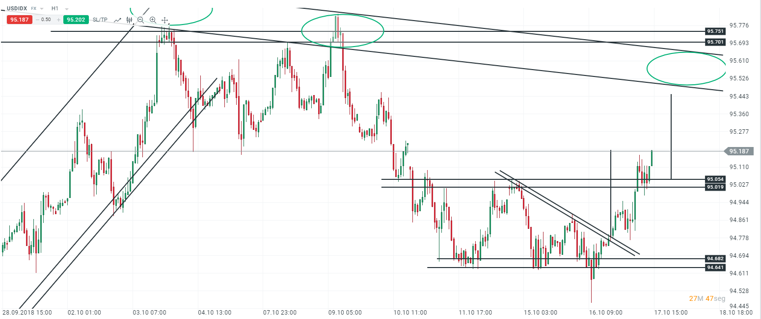 Durante la jornada de ayer y hoy hemos asistido a un fuerte movimiento a favor del Dólar a nivel internacional, como mostró la subida del Índice del Dólar. En el corto plazo, vemos como el Dólar está próximo a superar una directriz bajista que marca los últimos máximos decrecientes. A está hora estamos alcanzando el primer objetivo de la construcción de vuelta que formó durante los últimos días (95.17 ); desde este punto podríamos esperar una extensión que nos lleve al objetivo de un doble suelo, que lo situaríamos en las inmediaciones de los 95.44, punto a partir del cual empezaríamos a encontrarnos con la gran directriz bajista que guía los precios desde los máximos del pasado agosto (mucha atención a esta zona, ya que superada, podría dar lugar a un nuevo impulso alcista de medio-largo plazo.