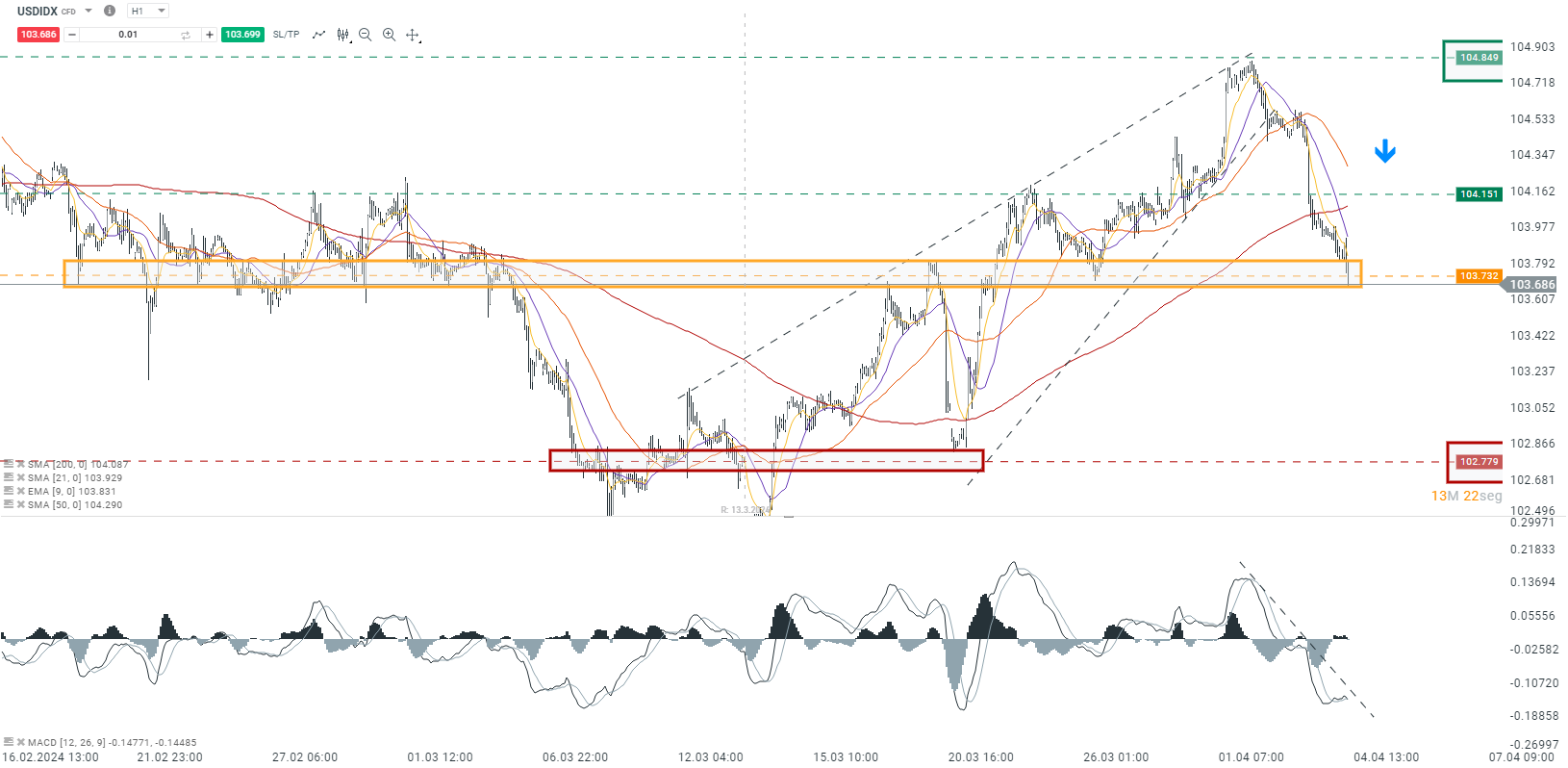 El dolar index retrocedio luego de la retorica de los miembros de los bancos centrales estadounidenses, de que realmente van a realizar los recortes que se tenian previsto, el indice se ubica en una zona clave en los 103.732. por lo que rupturas o correcciones en torno a este nivel podrian macar la direccion del indice. Fuente: xStation 5