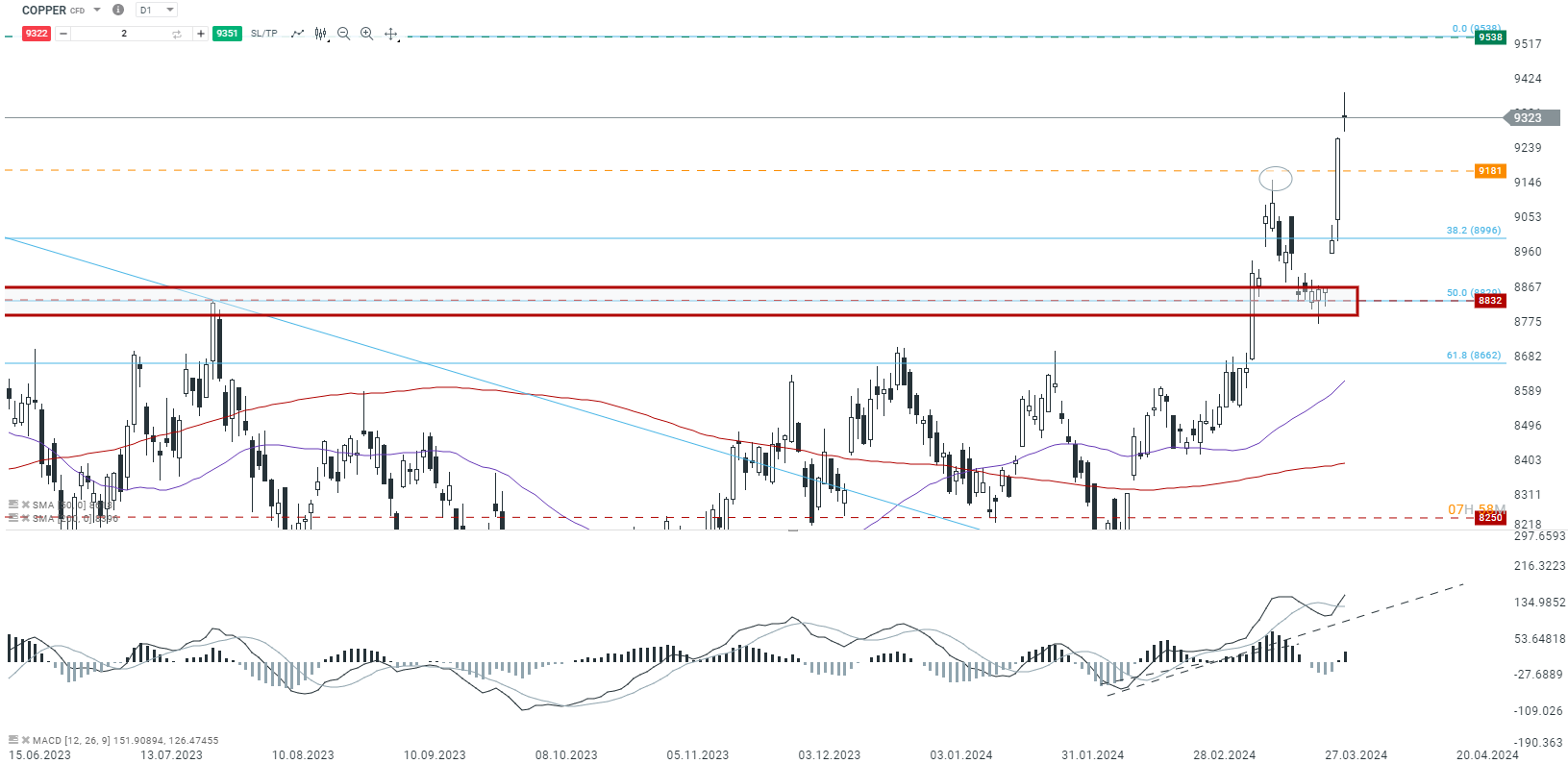 El precio del cobre inicia al alza hoy, operando cerca de los 9300. El nivel de 9181, fijado al inicio de la semana, se perfila como clave. El oscilador MACD sugiere una divergencia alcista, anticipando posible continuidad en el impulso alcista, apoyado por el incremento del PMI en China que mejora las expectativas y añade incertidumbre sobre la oferta de cobre. Por lo tanto, si el cobre se sostiene sobre los 9181, podría extender su avance hacia los 9538. En el caso de una caída por debajo de los 9181 podría llevar el precio hacia los 8832.