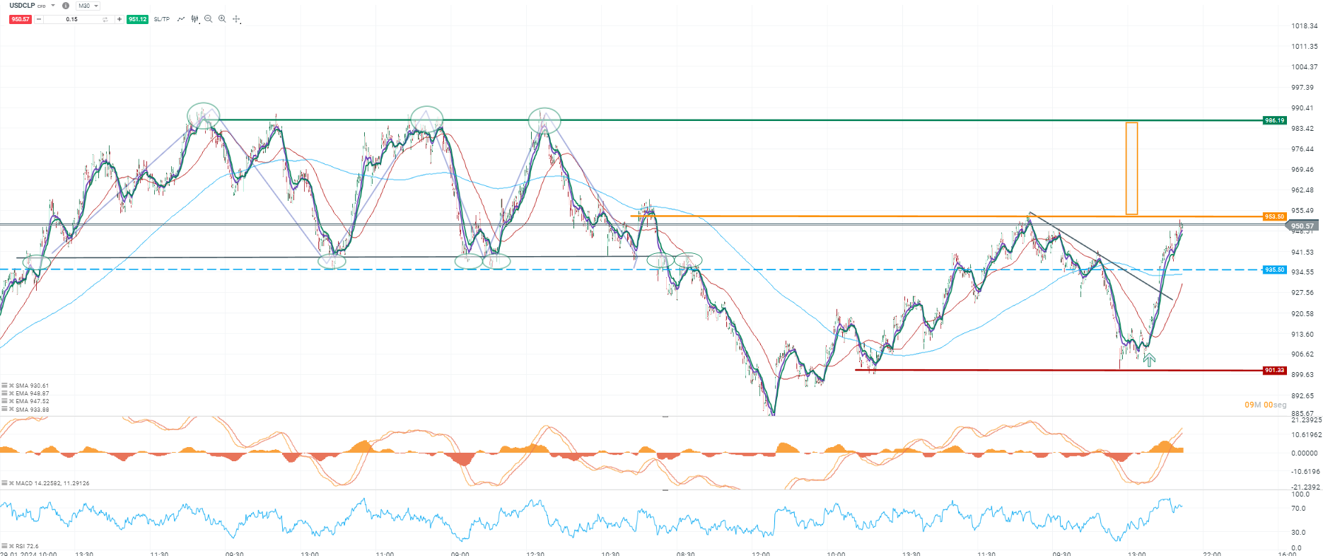 El desplome en el valor del cobre ha contribuido al aumento del valor del dólar en Chile, que actualmente cotiza por encima de los $948, superando el precio de cierre del pasado viernes. Si la tendencia alcista continúa, no sería extraño ver el tipo de cambio consolidarse por encima de los $950 y buscar los máximos de junio por encima de los $955, antes de apuntar a los máximos del año, superando los $990.